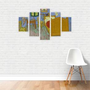 Kit 5 Quadros O Quarto Van Gogh Arte Canvas 110X65Cm Tamanho: Conjunto de 5 quadros conjugados com imagem em continuidade com medida total de 110x65cm, sendo: 2 quadros de 20x30cm; 2 quadros de 20x50cm; 1 quadros de 20x65cm; Acompanha manual com dicas de instalação. Canvas: Sua experiência com esse material será inesquecível. Você pode achar que não conhece tecido canvas, mas com certeza já deve ter visto um quadro em tela, como uma pintura ou em um museu, pois o mesmo é utilizado para as mais belas pinturas. O tecido canvas é um material 100% algodão com preparação especial, tratamento anti bacteriano, antimofo e verniz semibrilho, apropriada para a impressão. Chassi madeira : É a estrutura de madeira eucalipto beneficiado de reflorestamento onde o tecido impresso é esticado cuidadosamente. A melhor estrutura para quadros e telas com madeira de 3x2,3cm de espessura, chanfrada para não marcar a parte frontal de sua tela, é grampeada pelo verso dando um acabamento especial, onde suas imagens aparecem até mesmo na volta da madeira Assim seu quadro chega pronto para pendurar e não necessita de moldura Embalagem: Feita cuidadosamente envolvendo as peças com filme stretch pvc, para que diminua quase a zero as chances de marcar de alguma maneira seu quadro no transporte. O mesmo é colocado em uma caixa feita especialmente para o seu tamanho de quadro, assim seu quadro fica bem mais firme dentro da embalagem. Marca: Não Informado