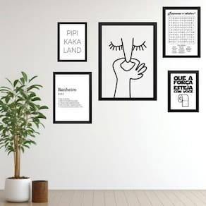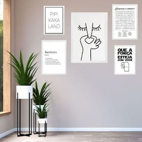 Kit 5 quadros para banheiro frases divertidas - com vidro Moldura: madeira branca Informações do produto tire todas as suas dúvidas no descritivo abaixo: decoração para quarto, sala, cozinha, escritório, área gourmet e muito mais. Chega de paredes vazias medidas - kit composto por 5 quadros, sendo 2 quadros com medida 18x24cm, 2 quadros com 24x33cm e 1 quadro com medida 33x45cm. Material do papel - papel fotográfico brilhante de altíssima resolução acabamento - todos os quadros são acompanhados de vidro para proteção da imagem. - moldura em madeira maciça na cor preta ou branca conforme produto escolhido e pendurador . - os quadros são embalados de forma segura com plástico bolha com camada dupla de acordo com o tamanho dos quadros. Garantia - garantia de 3 meses. Meu quadro chegou. Como posso fixá-lo Você precisa apenas de um martelo e um prego, pois os quadros já vão acompanhados de penduradores. Esta é a forma mais indicada. Como posso limpar meu quadro A limpeza é feita como um móvel comum da sua casa. Apenas um pano seco ou espanador são suficientes para tal Ean: 7897186944111