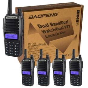 Rádio comunicador baofeng uv-82 neste kit são inclusos 5 radios baofeng uv-82 -128 canais. O rádio comunicador é ideal para profissionais que necessitam de comunicação rápida durante o dia, com a praticidade de apertar apenas um botão. Possui alta qualidade, obtendo maior clareza e qualidade nas comunicações a longa distância. Com diferentes profundidades de sinal, haverá diversos canais disponíveis, proporcionando um som claro e sem interferência características: - transmissor dual-band - display lcd - função vox - memória para 128 canais - função bipe no teclado - função alarme - lanterna embutida - modo scan - programável pelo computador - bateria de lítio de alta capacidade - rádio fm - modo economia de bateria - codificado em dtmf informações técnicas: - produto: rádio comunicador baofeng - modelo: uv-82 - material: plástico rígido - cor: preto - memória: 128 canais - alcance: até 12 km em campo aberto - potência de saída: 5w - voltagem: dc 7.4v - bateria interna de lítion 2800mah - modelo da bateria: bl- 8 - duração da bateria: cerca de 12 horas - tempo de carregamento: aproximadamente 5 horas - consumo: 380mah - estabilidade de frequência: 2.5 ppm - impedância da antena: 50 ohm - modo de operação: simples ou semi-duplo - range de frequência: 65mhz -108mhz recepção rádio fm vhf: 136 mhz -174mhz rx-tx uhf: 400 mhz - 520mhz rx-tx - resposta especulativo: 60db - potência de saída de áudio: 1000mw - dimensões: 5,5x 11x 3,2 cm - peso do rádio: 210 g - peso total da caixa: 468 g lista de embalagem: - 5 rádio uv-82 - 5 bateria - 5 alça de mão - 5 clipe de cinto - 5 fonte de alimentação - 5 fone de ouvido - 5 base carregador de mesa - 5 manual do usuário