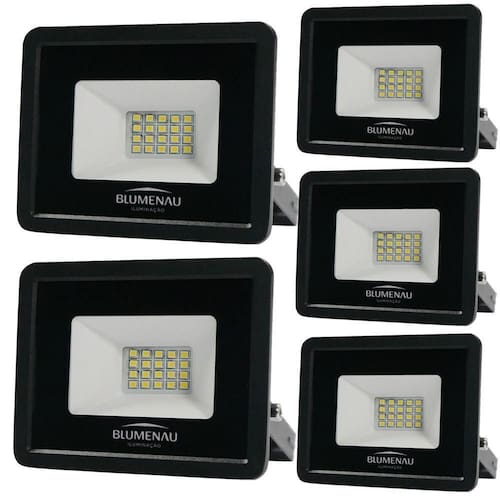 Kit 5 Refletor de Led Slim 20W Prova Dágua Preto Bivolt 6500K Frio