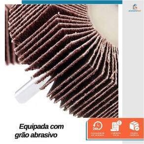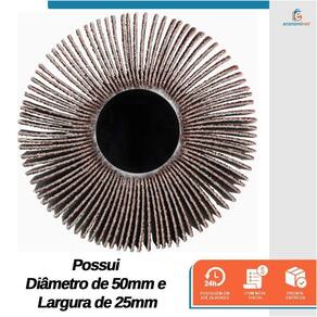 Principais características: Possui um diâmetro de lixa de 50mm e uma largura de 25mm Equipada com grão abrasivo 60 Fabricada com óxido de alumínio O pino de 1/4 6mm permite um encaixe fácil em furadeiras Com uma haste de 38mm Suporta uma rotação máxima de 13500RPM Saco plástico com testeira, contendo 5 unidades Ref.: 12019122 Marca: Starfer Ean: 7908685205044