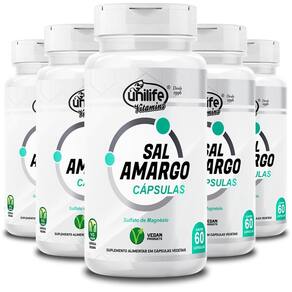Kit 5 sal amargo unilife 60 cápsulas 850mg Modo de ingestão: Sugere-se a ingestão de 2 cápsulas ao dia preferencialmente em jejum. Ingerir com líquido. Ingredientes: Sulfato de magnésio heptaidratado, óxido de magnésio e antiumectantes dióxido de silício e estearato de magnésio. Cápsula: gelatina vegetal e água purificada. Peso total de cada cápsula: 850mg. Livre de lactose. Não contém glúten. Produto vegano. Produto autorizado para comercialização em todo o território nacional através do anexo i da rdc 240/2018 da anvisa. Afe do ms 6.02234-1. Marca: Não Informado