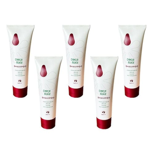 AS IMAGENS SÃO MERAMENTE ILUSTRATIVAS E PODEM SOFRER VARIAÇÕES DE COR E PEQUENOS DETALHES DE ACORDO COM O SEU MONITOR, ILUMINAÇÃO DO AMBIENTE E ATÉ MESMO A SUA PERCEPÇÃO VISUAL.Kit 5 Shampoo Doce Raiz Natural de Extrato de Batata Doce de 250ml