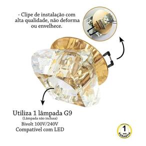 O destaque deste spot é a base dourada brilhosa, sendo uma grande novidade no brasil. Sua tonalidade dourada adiciona um elemento de luxo e exposto ao design, complementando perfeitamente o brilho do cristal. O seu cristal k9 de alta qualidade, conhecido por sua pureza e claridade induzida. O cristal k9 é lapidado com maestria para capturar a luz de forma brilhante, criando um jogo de reflexos e cintilações impressionantes. Ele confere um efeito luminoso e glamoroso, proporcionando um toque de beleza radiante ao espaço onde for colocado. Neste kit contem 05 spots. Descrição: - material: cristal transparente e inox. -cor da base: dourado brilhante - dimensões: --comprimento: 6,9 cm --largura: 6,9 cm --altura do spot: 4 cm --altura total do spot: 6 cm - dimensões da base dourada brilhante: --comprimento: 8 cm --largura: 8 cm - recorte no teto : 6 cm - quantidade de lâmpadas: 1 - bocal: g9 - potência máxima: 40w - tensão: bivolt; - : 1 ano - lâmpadas compatíveis para esse spot: lâmpada g9 led 3w, 5w ou 7w. Lâmpada não inclusa Marca: Não Informado