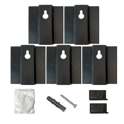 • 5 Suportes de espelho/quadro/armário • 10 Niveladores (calços) • 1 Saquinho com cola especial para fixar espelhos • 5 Buchas de 8mm • 5 Parafusos de 8mm