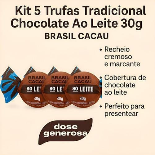 O Kit com 5 Trufas Tradicional Brasil Cacau é ideal para quem ama chocolate e não abre mão de qualidade. Cada trufa traz o recheio cremoso e marcante que conquista gerações, envolto por uma cobertura de chocolate ao leite irresistível.