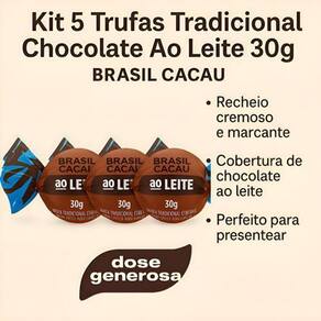 O Kit com 5 Trufas Tradicional Brasil Cacau é ideal para quem ama chocolate e não abre mão de qualidade. Cada trufa traz o recheio cremoso e marcante que conquista gerações, envolto por uma cobertura de chocolate ao leite irresistível.