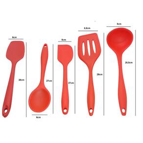 Ideais para proteger suas panelas antiaderentes de arranhões, os talheres que compõem esse kit são fabricados em material de silicone e nylon de ótima qualidade, também são resistentes a altas temperaturas e livres de BPA. – Fácil de limpar: podem ser lavados na máquina de lavar a louça – Duráveis, flexíveis, não se deformam – Não riscam a panela – Possuem furo para pendurar– Material: Silicone– Cor: Vermelho Contém: 1 Concha (28,5cm x 8cm) 1 Colher (27cm x 6cm) 1 Colher reta (28cm x 6cm) 1 Espátula vazada (29cm x 8,5cm)1 Espátula pão duro (27cm x 5cm)