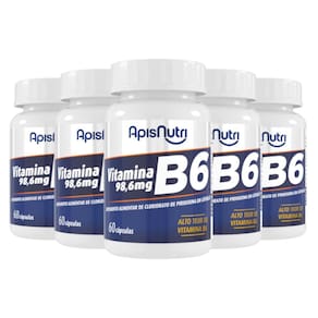 Kit 5 Vitamina B6 Apisnutri 98,6mg 60 Cápsulas Sobre o produto Desempenhando papel importante para a saúde, a piridoxina pode ser encontrada em carnes vermelhas, fígado, frango, peixes, leite, ovos, germe de trigo, soja, arroz, banana, couve-flor, brócolis, milho, aveia, etc. Atua na criação das células do sistema imune, formação dos glóbulos vermelhos, metabolismo de gorduras, carboidratos, proteínas e do glicogênio, na síntese do aminoácido cisteína e na fisiologia da homocisteína, a vitamina B6 é essencial para a produção de energia. Modo de usar Ingerir 1 cápsula ao dia. Recomendação de uso: 19 dezenove anos ou acima. este produto não é um . não exceder a recomendação diária de consumo indicada na embalagem. mantenha fora do alcance de crianças. gestantes e lactantes, somente devem consumir este produto sob orientação de nutricionista ou médico. Manter a embalagem bem fechada e em local seco e fresco. Não expor a luz solar. Após aberto consumir em até 90 dias. Isento de registro no M.S. Conforme RDC 240/2018. Apresentação Classificação: Suplemento alimentar de Cloridrato de Piridoxina em cápsulas Quantidade de cápsulas: 60 cápsulas de 350mg Peso Líquido: 18g