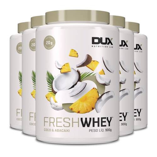 Kit 5 Whey Protein Fresh Dux Abacaxi e Coco 900g modo de consumo: consumir até 2 porções 58 g ao dia ou conforme orientação do de saúde. Modo de preparo: adicione uma porção de 1 dosador 29 g de fresh whey em 250 ml de água e misture utilizando uma coqueteleira até homogeneizar. Consuma imediatamente. Modo de conservação: conservar ao abrigo de luz, calor e umidade. Após aberto, consumir em até 120 dias. Manter a embalagem fechada após o uso. Alérgicos: contém derivados de soja e leite. Pode conter trigo, aveia, amendoim, amêndoa, avelãs, castanha-de-caju e pistaches. Contém lactose. Contém glúten. Marca: Não Informado