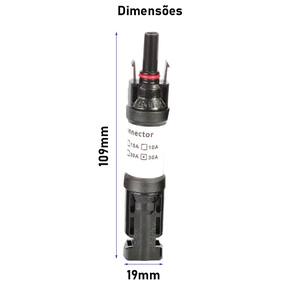 Especificações: - Material do encapsulamento: PPO/PC - Material do contato: cobre com banho de estanho - Corrente nominal: 30A - Tensão nominal: 1000V - Tensão de teste: 6000V (50Hz, 1min) - Resistência do contato: menor que 0,5 mili Ohm - Grau de proteção: IP67 - Faixa de temperatura do ambiente: -40 a 85 C - Classe antichama: UL94-VO - Dimensão do pino: 4mm (padrão MC4) - Marca: Solemais Marca: Snaterm