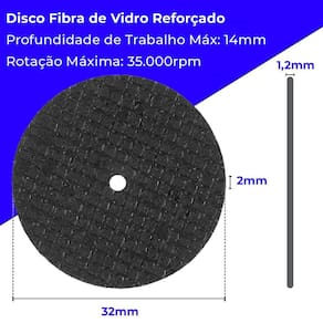 Disco de corte 32mm reforçado em fibra de vidro para micro retíficas de qualquer marca. Permite realizar cortes retos e ranhuras de forma limpa em materiais de alta resistência à tração.