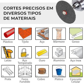 - Permite realizar cortes retos e ranhuras de forma limpa em materiais de alta resistência à tração. Indicado para todos os tipos de metal, como aço temperado, chapa metálica ou alumínio, além de madeira fina, plásticos, mármore, gesso, tijolos e cerâmica.