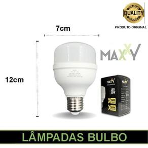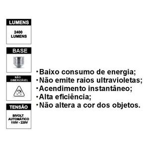 Material: base de alumínio / corpo e bulbo em plástico Cor: branco frio Temperatura da luz: 6500k Base: e27 Fluxo luminoso: 2400lm Índice de reprodução de cor irc : 80 Vida útil: 25.000h l70 Potência: 30w Tensão nominal: 100 0.225a - 240v 0.130a Frequência: 60hz Fator de potência: maior ou igual 0,92 Temperatura de operação: -20ºc a 40ºc Eficiência luminosa: 80lm/w Dimensões: 70 x 112mm Peso líquido: 58g