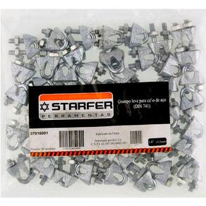Grampo para cabo de aço tipo leve é fabricado em aço carbono fundido galvanizado.Utilizado na construção de laços e amarrações em cabos de aço ou cordoalhas nos processos de amarração de cargas.• Para cabos de espessura 1/8" (3,18mm).• Norma DIN 741• Capacidade de torção: 1,12Kgf/m2 (11,00N.m)Pacote com 500 unidadesRef. 07016001Marca: Starfer