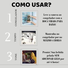 Modo de Uso Simples: Coloque a caneca no freezer sempre com a boca para baixo. Deixe lá por no máximo 4 horas.
