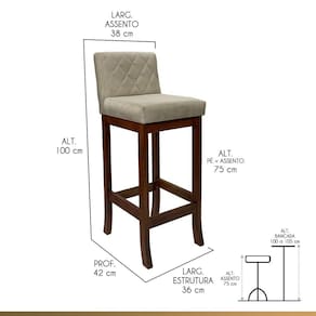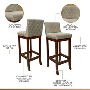 A banqueta Tóquio é a fusão perfeita entre requinte e comodidade. Fabricada com madeira maciça proveniente de reflorestamento e acabamento em verniz, sua estrutura promove durabilidade e um charme natural. O assento, preenchido com espuma D26, e o encosto, com espuma D23, proporcionam um suporte ergonômico incomparável. O toque de elegância é evidenciado pelo detalhe da costura matelassê no encosto, enquanto o revestimento em suede adiciona um acabamento luxuoso. A banqueta Tóquio é a escolha ideal para elevar o conforto e a sofisticação de qualquer ambiente. CARACTERÍTICAS TÉCNICAS: - Produzido em Madeira Maciça de Reflorestamento; - Acabamento em Verniz na cor Castanho; - Assento Preenchido com Espuma D26; - Encosto Preenchido com Espuma D23; - Encosto com Costura Matelassê; - Revestimento em Suede na cor Bege. *Indicada para Bancadas/Mesas com Alt. 100/105cm. *PRODUTO ENVIADO MONTADO. INFORMAÇÕES TÉCNICAS: Altura Total: 100 Cm Altura até Assento: 75 Cm Altura até Travessa: 23 Cm Altura Encosto: 35 Cm Largura Assento: 38 Cm Largura Estrutura: 36 Cm Profundidade Total: 42 Cm Profundidade Assento: 41 Cm Peso: 7 kg * Kit Composto por 6 Banquetas Tóquio. INFORMAÇÕES ADICIONAIS: ATENÇÃO: Móvel produzido em madeira maciça natural podendo ocorrer mudança no tom da madeira conforme o produto. *Conferir se o produto está de acordo com o que comprou, produto danificado não será aceito troca. **As imagens ambientadas são meramente ilustrativas e podem apresentar itens que não compõe o produto. As cores do produto podem variar de acordo com o monitor, a iluminação do ambiente ou sua percepção visual. ***Limpeza deve ser feita com pano macio e seco ou levemente umedecido com água e sabão neutro. Não devem ser utilizados produtos abrasivos. Garantia para defeitos de fabricação conforme Código de Defesa do Consumidor. Marca: CCS Interiores