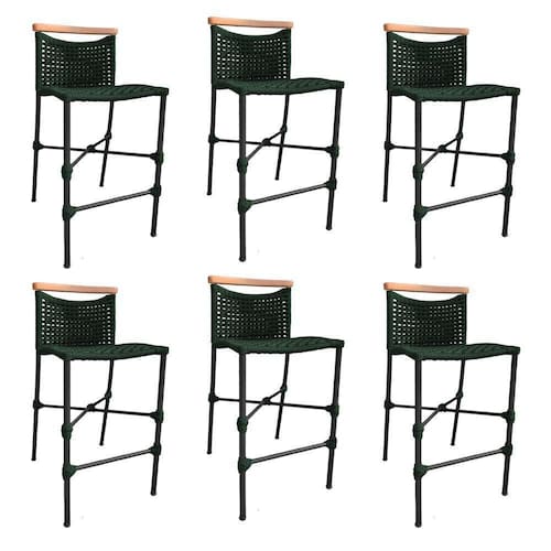 Kit 6 Banquetas Em Corda Náutica Base Em Alumínio Preta Com Detalhe Em Madeira Verde Musgo Verde - Preto
