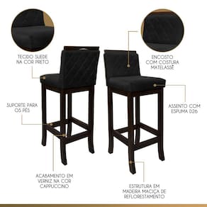 Apresentamos a banqueta Nice, feita com madeira maciça de reflorestamento e acabamento em verniz. Seu assento preenchido com espuma D26 e encosto com espuma D23 garantem conforto duradouro. O encanto adicional vem da costura matelassê no encosto, enquanto o revestimento em suede adiciona uma sensação de luxo. Adapta-se perfeitamente a qualquer espaço, adicionando elegância e conforto instantaneamente. CARACTERÍTICAS TÉCNICAS: - Produzido em Madeira Maciça de Reflorestamento; - Acabamento em Verniz na cor Capuccino; - Assento Preenchido com Espuma D26; - Encosto Preenchido com Espuma D23; - Encosto com Costura Matelassê; - Revestimento em Suede na cor Preto. *Indicada para Bancadas/Mesas com Alt. 90/95 cm. *PRODUTO ENVIADO MONTADO. INFORMAÇÕES TÉCNICAS: Altura Total: 92 cm Altura até Assento: 65 cm Altura até Travessa: 13 cm Altura Encosto: 35 cm Largura Assento: 38 cm Largura Estrutura: 36 cm Profundidade Total: 42 cm Profundidade Assento: 41 cm Peso: 7 kg *Kit Composto por 6 Banquetas Nice. INFORMAÇÕES ADICIONAIS:ATENÇÃO: Móvel produzido em madeira maciça natural podendo ocorrer mudança no tom da madeira conforme o produto;*Conferir se o produto está de acordo com o que comprou, produto danificado não será aceito troca;**As imagens ambientadas são meramente ilustrativas e podem apresentar itens que não compõe o produto. As cores do produto podem variar de acordo com o monitor, a iluminação do ambiente ou sua percepção visual;***Limpeza deve ser feita com pano macio e seco ou levemente umedecido com água e sabão neutro. Não devem ser utilizados abrasivos como palha de aço e objetos cortantes;Garantia para defeitos de fabricação conforme Código de Defesa do Consumidor. Marca: CCS Interiores
