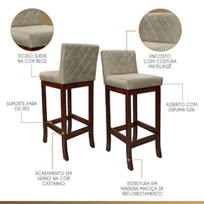 A banqueta Tóquio é a fusão perfeita entre requinte e comodidade. Fabricada com madeira maciça proveniente de reflorestamento e acabamento em verniz, sua estrutura promove durabilidade e um charme natural. O assento, preenchido com espuma D26, e o encosto, com espuma D23, proporcionam um suporte ergonômico incomparável. O toque de elegância é evidenciado pelo detalhe da costura matelassê no encosto, enquanto o revestimento em suede adiciona um acabamento luxuoso. A banqueta Tóquio é a escolha ideal para elevar o conforto e a sofisticação de qualquer ambiente. CARACTERÍTICAS TÉCNICAS: - Produzido em Madeira Maciça de Reflorestamento; - Acabamento em Verniz na cor Castanho; - Assento Preenchido com Espuma D26; - Encosto Preenchido com Espuma D23; - Encosto com Costura Matelassê; - Revestimento em Suede na cor Bege. *Indicada para Bancadas/Mesas com Alt. 90/95cm. *PRODUTO ENVIADO MONTADO. INFORMAÇÕES TÉCNICAS: Altura Total: 90 Cm Altura até Assento: 65 Cm Altura até Travessa: 13 Cm Altura Encosto: 35 Cm Largura Assento: 38 Cm Largura Estrutura: 36 Cm Profundidade Total: 42 Cm Profundidade Assento: 41 Cm Peso: 7 kg * Kit Composto por 6 Banquetas Tóquio. INFORMAÇÕES ADICIONAIS: ATENÇÃO: Móvel produzido em madeira maciça natural podendo ocorrer mudança no tom da madeira conforme o produto. *Conferir se o produto está de acordo com o que comprou, produto danificado não será aceito troca. **As imagens ambientadas são meramente ilustrativas e podem apresentar itens que não compõe o produto. As cores do produto podem variar de acordo com o monitor, a iluminação do ambiente ou sua percepção visual. ***Limpeza deve ser feita com pano macio e seco ou levemente umedecido com água e sabão neutro. Não devem ser utilizados produtos abrasivos. Garantia para defeitos de fabricação conforme Código de Defesa do Consumidor. Marca: CCS Interiores