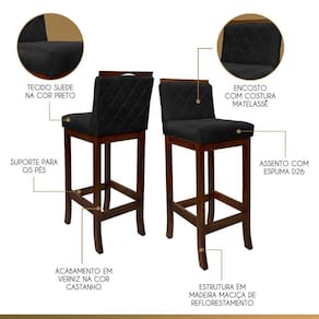Apresentamos a banqueta Nice, feita com madeira maciça de reflorestamento e acabamento em verniz. Seu assento preenchido com espuma D26 e encosto com espuma D23 garantem conforto duradouro. O encanto adicional vem da costura matelassê no encosto, enquanto o revestimento em suede adiciona uma sensação de luxo. Adapta-se perfeitamente a qualquer espaço, adicionando elegância e conforto instantaneamente. CARACTERÍTICAS TÉCNICAS: - Produzido em Madeira Maciça de Reflorestamento; - Acabamento em Verniz na cor Castanho; - Assento Preenchido com Espuma D26; - Encosto Preenchido com Espuma D23; - Encosto com Costura Matelassê; - Revestimento em Suede na cor Preto. *Indicada para Bancadas/Mesas com Alt. 90/95 cm. *PRODUTO ENVIADO MONTADO. INFORMAÇÕES TÉCNICAS: Altura Total: 92 cm Altura até Assento: 65 cm Altura até Travessa: 13 cm Altura Encosto: 35 cm Largura Assento: 38 cm Largura Estrutura: 36 cm Profundidade Total: 42 cm Profundidade Assento: 41 cm Peso: 7 kg *Kit Composto por 6 Banquetas Nice. INFORMAÇÕES ADICIONAIS:ATENÇÃO: Móvel produzido em madeira maciça natural podendo ocorrer mudança no tom da madeira conforme o produto;*Conferir se o produto está de acordo com o que comprou, produto danificado não será aceito troca;**As imagens ambientadas são meramente ilustrativas e podem apresentar itens que não compõe o produto. As cores do produto podem variar de acordo com o monitor, a iluminação do ambiente ou sua percepção visual;***Limpeza deve ser feita com pano macio e seco ou levemente umedecido com água e sabão neutro. Não devem ser utilizados abrasivos como palha de aço e objetos cortantes;Garantia para defeitos de fabricação conforme Código de Defesa do Consumidor. Marca: CCS Interiores