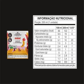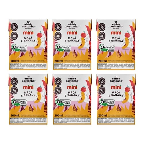 Kit 6 Mini Maçã e Banana 200 ml - A Tal da Castanha Nutrição prática, sabor natural e energia para a rotina. O Mini Maçã e Banana 200 ml - A Tal da Castanha é uma bebida 100% plant-based que une a doçura da maçã com a cremosidade da banana em uma fórmula nutritiva e equilibrada. Ideal para quem busca praticidade no dia a dia, ele é fonte de fibras, rico em cálcio e fornece 3g de proteína vegetal por unidade, acompanhando a energia das crianças e adultos em qualquer momento. Com ingredientes orgânicos e naturais, essa versão foi pensada para oferecer um lanche saudável, saboroso e pronto para beber. Uma alternativa nutritiva e deliciosa aos produtos de origem animal, perfeita para quem deseja incluir mais opções vegetais na rotina. Diferenciais do Produto - 100% plant-based - Rico em cálcio - Fonte de fibras - 3g de proteína vegetal por unidade - Sabor natural de maçã e banana - Prático e pronto para beber Sugestões de Consumo - Como lanche nutritivo entre as refeições - Ideal para a lancheira escolar - Para levar em passeios, viagens ou piqueniques - Como opção leve e prática no dia a dia Ingredientes Água, castanha de caju orgânica, açúcar demerara orgânico, farinha de aveia sem glúten orgânica, fibra de chicória, carbonato de cálcio, purê de banana orgânico, suco de maçã, proteína de fava e aromas naturais. Informações para Alérgicos Contém castanha de caju e derivados de aveia Não contém glúten Como Tomar Este produto não deve ser para alimentar crianças menores de 1 um ano de idade. O aleitamento materno evita infecções e alergias e é recomendado até os 2 dois anos de idade ou mais. Modo de Armazenar Conservar em local arejado, seco e/ou refrigerado. Após aberto, consumir imediatamente. Sobre a Marca A Tal da Castanha é a família de alimentos plant-based mais natural. Em cada produto, uma receita para um mundo melhor. Mais que uma marca, é um movimento que respeita e valoriza pessoas, animais e natureza, gerando impactos positivos na sociedade, na economia e no meio ambiente.