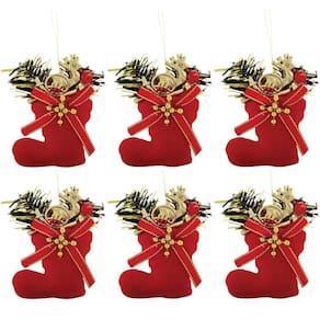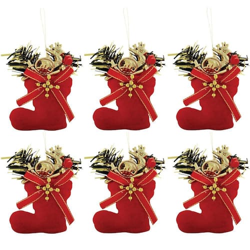 Transforme sua casa em um refúgio natalino com o Kit de 6 Botinhas Decoradas de Veludo Vermelho com Mini Rena e Corneta Dourada!
