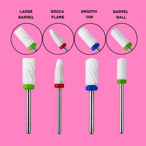 Broca Smooth Top: Refinamento e alisamento da superfície da unha, especialmente próxima às cutículas, garantindo um acabamento uniforme e seguro; A ponta arredondada reduz significativamente o risco de machucar a cutícula ou a pele ao redor da unha.