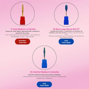 F-Gold Medium Umbrella: Possui um corte médio, ideal para polir e suavizar a superfície das unhas. A cor dourada indica que ela possui revestimento de alta qualidade, o que melhora a durabilidade e reduz o calor gerado. O formato de guarda-chuva é adequado para trabalhar áreas próximas à cutícula de forma segura.