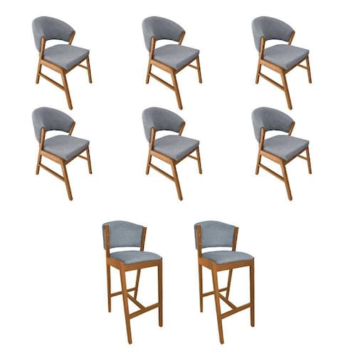 AS IMAGENS SÃO MERAMENTE ILUSTRATIVAS E PODEM SOFRER VARIAÇÕES DE COR E PEQUENOS DETALHES DE ACORDO COM O SEU MONITOR, ILUMINAÇÃO DO AMBIENTE E ATÉ MESMO A SUA PERCEPÇÃO 6 Cadeiras de Jantar Debora Madeira MaciÃa com 2 Banquetas Ana Cerejeira Premium Linho Cinza