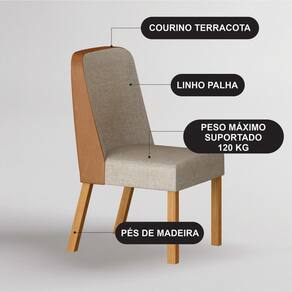 Destaques do Produto • ? Estrutura em madeira maciça de eucalipto – mais resistência e durabilidade • ? Encosto com detalhe em tecido sintético terracota – elegância e fácil manutenção • ? Assento e encosto com tecido confortável e sofisticado • ? Design anatômico que proporciona maior conforto no uso diário • ? Acabamento refinado, ideal para ambientes modernos e decorativos