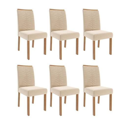 O Conjunto 6 Cadeiras Clarice une design sofisticado e conforto excepcional. Estruturada em madeira de eucalipto, reconhecida pela sua resistência e durabilidade, a peça traz assento e encosto estofados com espuma de alta densidade, proporcionando máximo conforto. O revestimento em tecido sued confere um toque macio e refinado, enquanto o encosto com detalhes bordados valoriza o visual com um acabamento elegante. Ideal para salas de jantar que buscam estilo e aconchego, a Cadeira Clarice é sinônimo de qualidade e bom gosto. Acabamento: Verniz Altura do Conjunto: 99 cm Ambiente: null Ambiente Principal: Sala de Jantar Cor: Madeira/Nude Informação Complementar: 3x Jogo com 02 Cadeiras Clarice Wood Ii Madeira/Nude Largura: 46 cm Altura: 99 cm Peso: 18 kg Profundidade: 57 cm Necessita Montagem: Sim