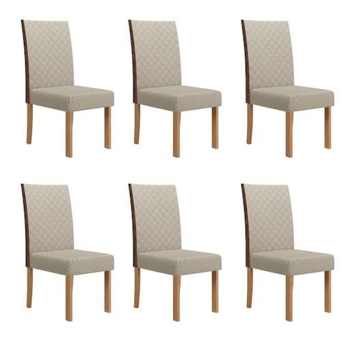 A cadeira Helo une conforto e elegância em um design moderno. Possui encosto interno bordado e laterais e encosto revestidas em courino, que valorizam o visual e facilitam a limpeza. O assento estofado garante o máximo de conforto, enquanto os pés em madeira com sapatas plásticas oferecem estabilidade e proteção ao piso. Ideal para compor ambientes sofisticados e acolhedores. Ambiente Principal: Sala de Jantar codigo_ean: 7900288267955 Complexidade da Montagem: Baixa: pode ser montado por uma pessoa sozinha Cor: Mel/Cinza/Marrom Cor do Produto: Mel/Cinza/Marrom Escala de Brilho: Brilhante Itens Inclusos: 6 Cadeiras, Kit Ferragens e Manual de Montagem Linha ou Coleção: Helo Manual de Especificação Técnica: https://product-hub-prd.madeiramadeira.com.br/410519901/documents/4c344f93-3fbd-4d89-90c6-8b386a8b742f3282444105617609926231134.pdf Manual de Montagem e Instalação: https://product-hub-prd.madeiramadeira.com.br/410519901/documents/d441cf78-6e7f-4f27-9258-68ed005254133282443105617609926219393.pdf Marca: Sonetto Móveis Material Principal: MDF Necessita Montagem: Sim Origem do Produto: Nacional Peso: 7,925 kg Possui Rodízio: Não Recomendações de Uso, Manutenção e Limpeza: Pano umedecido Sistema de Montagem: Parafuso, Cavilha, Sapata, Bucha , Porca, Arruela Marca: Não Informado