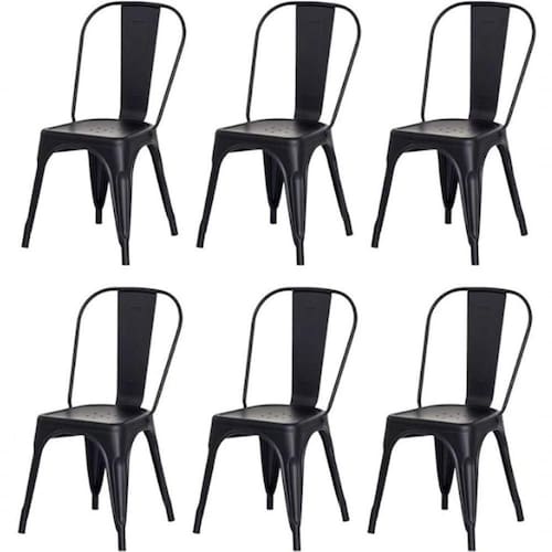 Kit 6 Cadeiras Tolix Fosca Aço Industrial Preto, Estilo Retrô Para Sala, Cozinha Ou Escritório Cadeira Tolix Iron Design Cadeira Fixa Design Tolix Metal Preta Conhecida popularmente como ?Cadeira Francesinha?, tem grande influência no mercado europeu devido ao seu elegante design retrô. O modelo clássico idealizado pelo francês Xavier Pauchard nos anos 20 foi resultado de seu experimento pioneiro da fabricação de móveis com metal galvanizado. A cadeira com formas simples, porém funcionais fez tanto sucesso que se tornou muito popular em fábricas, escritórios, restaurantes, bem como nos cafés, bares e parques públicos da época. Hoje conhecida como ?Cadeira Tolix?, é um ícone da estética industrial, podendo ser utilizada em qualquer ambiente trazendo elegância e personalidade. Com estrutura em aço de carbono e acabamento em pintura eletrostática, pode ser utilizada em ambientes externos. Projetada com alguns furos em seu assento com a finalidade de não acumular água, facilitando sua limpeza e manutenção. A ?Cadeira Tolix? é clássica, com design vintage e pode ser combinada com outros modelos de cadeiras. Disponível em variedade de cores, permitindo um ambiente mais descontraído.