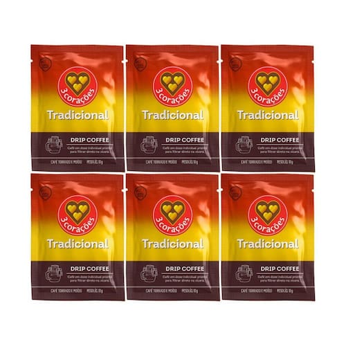 Kit 6 Sache de Café Torrado e Moído Tradicional 3 Corações - Sabor, aroma e tradição em cada xícara
