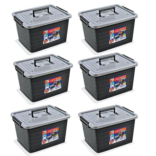 Kit 6 Caixas Organizadoras 50 Litros Preta com Tampa e Rodas 25167 Arqplast Kit 6 Caixas plásticas organizadoras com tampa, travas, alça e rodasMaterial: PolipropilenoCodigo de barras: 7898280071758Cor: Preta com tampa cinzaMedida do produto: 570x410x350 mm (Compr. X Lar. X Alt.)Capacidade: 50 litros