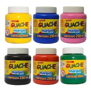 Especificações: - Aplicações: Para pintura em papel, papel cartão, cartolina, EVA, gesso, cerâmica; - Cores miscíveis entre si; - Solúvel em Água; - Produto não indicado para uso na pele; - Composição: Resina, água, pigmentos, carga e conservante; - Conteúdo da embalagem: 06 Potes de 250 ml; - Produto atóxico.