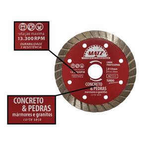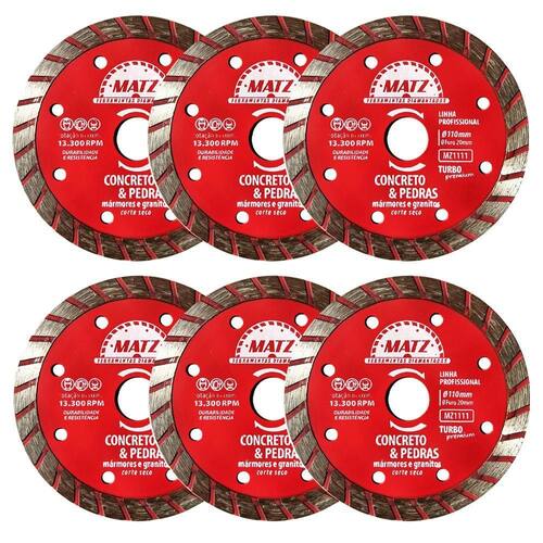 Kit 6 Disco Corte Diamantado Turbo Para Concreto 110X20Mm Matz Disco de corte turbo para pedras, concretos, mármores e granitos, ideal para cortes secos. Com design turbo, oferece alta velocidade e precisão, garantindo cortes limpos e sem lascas em materiais duros e abrasivos. Durável e resistente ao desgaste, é perfeito para aplicações que exigem desempenho e acabamento de qualidade. Ideal para construção civil e projetos de reforma. Informações técnicas: Perfil do corte: Turbo Diamantado Tipo de corte: A seco Dimensões: - Diâmetro externo: 110mm 4.3/8'' - Diâmetro do furo: 20mm - Perfil de corte: 10mm - Espessura: 2mm Rotação máxima por minuto RPM : 13.300 - 80m/s Para corte de: Concreto, pedra, mármore e granito Proporciona qualidade e produtividade na operação Produto de altíssima qualidade com alta performance KIT COM 6 UNIDADES Marca: Não Informado