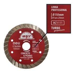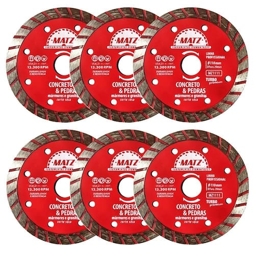 Kit 6 Disco Corte Diamantado Turbo Para Concreto 110X20Mm Matz Disco de corte turbo para pedras, concretos, mármores e granitos, ideal para cortes secos. Com design turbo, oferece alta velocidade e precisão, garantindo cortes limpos e sem lascas em materiais duros e abrasivos. Durável e resistente ao desgaste, é perfeito para aplicações que exigem desempenho e acabamento de qualidade. Ideal para construção civil e projetos de reforma. Informações técnicas: Perfil do corte: Turbo Diamantado Tipo de corte: A seco Dimensões: - Diâmetro externo: 110mm 4.3/8'' - Diâmetro do furo: 20mm - Perfil de corte: 10mm - Espessura: 2mm Rotação máxima por minuto RPM : 13.300 - 80m/s Para corte de: Concreto, pedra, mármore e granito Proporciona qualidade e produtividade na operação Produto de altíssima qualidade com alta performance KIT COM 6 UNIDADES Marca: Não Informado