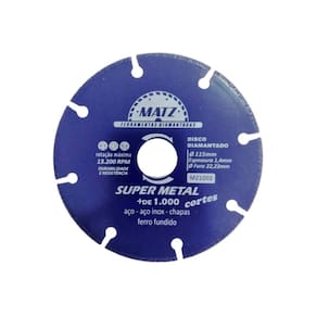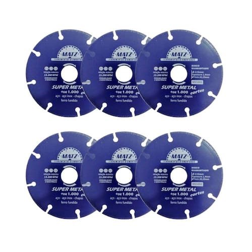 Kit 6 Disco Corte Esmerilhadeira Para Aço 115Mm X 22,23Mm Matz Disco de corte segmentado para aço, aço inox, chapas e ferro fundido, ideal para cortes secos e refrigerados. Desenvolvido para máxima resistência e durabilidade, oferece cortes rápidos e precisos em materiais metálicos, minimizando desgaste e aquecimento. Compatível com esmerilhadeira, possui furo adaptável e acompanha anel de redução para uso em serra mármore Makita . Seus segmentos garantem eficiência e excelente remoção de material, proporcionando um acabamento limpo e profissional.