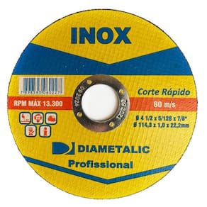 Informações técnicas: Tipo de corte: A seco Diâmetro externo: 115mm 4.1/4'' Diâmetro do furo: 22mm Rotação máxima por minuto: 15000 Para corte de Aço Inox Proporciona qualidade e produtividade na operação Produto de altíssima qualidade com alta performance