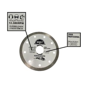 Informações técnicas: Perfil do corte: Turbo Diamantado Tipo de corte: A seco e refrigerado Dimensões: - Diâmetro externo: 110mm 4.3/8'' - Diâmetro do furo: 22,23mm 7/8'' - Acompanha anel de redução para 20mm - Perfil de corte: 8mm - Espessura: 1mm Rotação máxima por minuto RPM : 13.300 - 80m/s Para corte de: Porcelanato Proporciona qualidade e produtividade na operação Produto de altíssima qualidade com alta performance