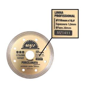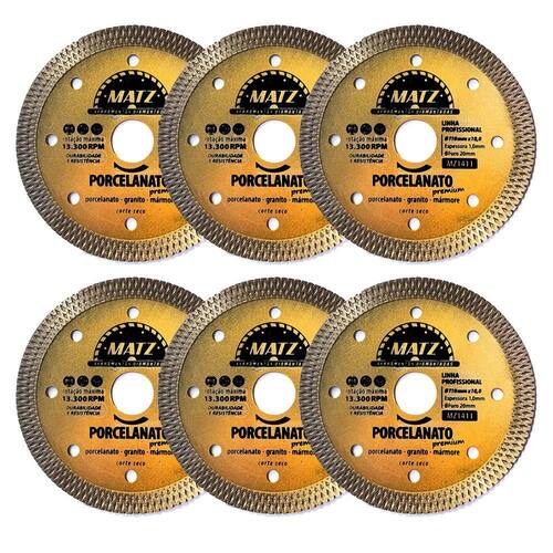 Kit 6 Disco Corte Turbo Para Porcelanato Premium 110X20Mm Matz Disco de corte turbo diamantado em X ideal para cortes secos em porcelanato, granito e mármore, projetado para precisão e velocidade. Suas estrias em X ajudam a dissipar o calor e reduzir o atrito, proporcionando cortes limpos e sem lascas em materiais delicados. Com alto desempenho e resistência, é perfeito para profissionais que buscam eficiência e acabamento impecável. Indicado para trabalhos em porcelanato e outros revestimentos cerâmicos.