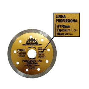Informações técnicas: Perfil do corte: Liso Diamantado Tipo de corte: A seco Dimensões: - Diâmetro externo: 110mm 4.3/8'' - Diâmetro do furo: 20mm - Perfil de corte: 8mm - Espessura: 1,2mm Rotação máxima por minuto RPM : 13.300 - 80m/s Para corte de: Porcelanato, mármore e marmoglass Proporciona qualidade e produtividade na operação Produto de altíssima qualidade com alta performance