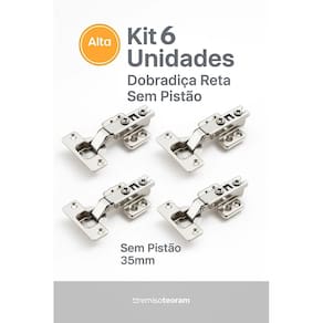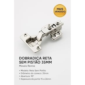 O Kit com 6 Dobradiças Retas 35mm Sem Pistão Renna é a solução ideal para quem busca praticidade e resistência na instalação de móveis planejados, armários e gavetas. Produzidas em aço de alta qualidade com tratamento anticorrosivo, garantem durabilidade e excelente desempenho no uso diário.