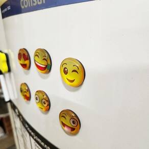 Kit 6 Emoticons Com Imã Humor Para Geledeira Quadro Metálico Kit com 6 emoticons de vidro com manta magnético forte, que adere a qualquer superfície metálica como geladeira, freezer e quadros de panejamento. Diâmetro: 3cm Material: Vidro e manta magnética