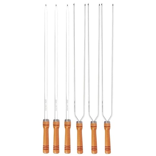 Garanta praticidade, segurança e ótimo desempenho no preparo do seu churrasco com o Kit com 6 Espetos Mor, composto por 3 espetos duplos e 3 espetos simples, todos com 75 cm de comprimento. Um conjunto versátil e resistente, ideal para churrasqueiras de diversos tamanhos e para diferentes tipos de alimentos. Fabricados em aço cromado de alta resistência, os espetos oferecem durabilidade mesmo sob altas temperaturas. Os cabos de madeira garantem firmeza no manuseio e proteção contra o calor, tornando o uso mais seguro e confortável. Composição do kit: 3 espetos simples de 75 cm 3 espetos duplos de 75 cm Destaques do produto: Espetos em aço cromado: mais durabilidade e resistência ao calor Cabo de madeira: evita aquecimento e facilita o manuseio Espeto duplo: ideal para carnes maiores e alimentos que precisam de mais estabilidade Espeto simples: versátil para carnes fatiadas, linguiças, legumes e pães Comprimento ideal para churrasqueiras residenciais Fácil higienização e armazenamento Especificações técnicas: Marca: Mor Material: Aço cromado + cabo de madeira Comprimento total: 75 cm Comprimento da lâmina: 60 cm Comprimento do cabo: 15 cm Diâmetro da lâmina: 0,25 mm : 90 dias Observação: Imagens meramente ilustrativas. Os objetos de ambientação não acompanham o produto. Aumente sua produtividade e torne o preparo do churrasco mais prático com o Kit 6 Espetos Mor - robustez e eficiência em cada detalhe. Marca: Não Informado