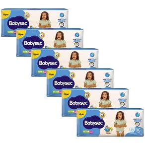 O Kit contém: 6 pacotes de Fraldas Babysec Galinha Pintadinha Ultrasec Hiper Tamanho XG com 56 unidades cada.
