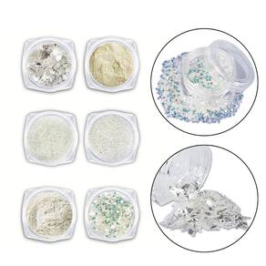 Características Principais: - 6 potinhos individuais; - Variados tons de branco; - Combinação de glitters finos, flocados e pó cromado; - Texturas variadas e efeitos brilhantes; - Tampa rosqueável que evita desperdício e facilita o armazenamento; - Ideal para quem busca adicionar mais glamour e criatividade aos seus designs.