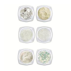 Características Principais: - 6 potinhos individuais; - Variados tons de branco; - Combinação de glitters finos, flocados e pó cromado; - Texturas variadas e efeitos brilhantes; - Tampa rosqueável que evita desperdício e facilita o armazenamento; - Ideal para quem busca adicionar mais glamour e criatividade aos seus designs.